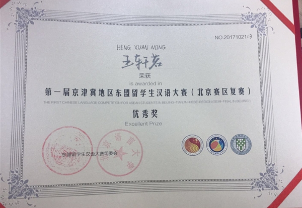 本学期,王轩茗代表学校、学院参加多项比赛,成绩优异。代表学院参加北京语言大学第八届“你好,先‘声’”语音语调大赛,荣获中文组二等奖,其精彩的表现、友好机智的形象获得与赛嘉宾、评委和队友的一致好评。代表学校参加第一届京津冀地区东盟留学生汉语大赛,获得北京区复赛优秀奖。