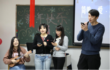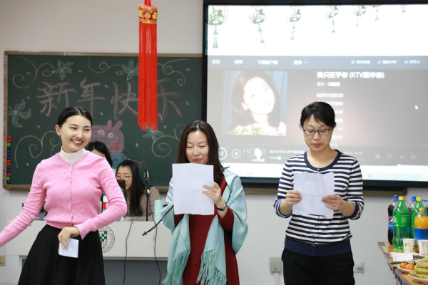 由新人教师房艳霞、李若凡、潘夏韵、李丹芸老师带来的一首尤克里里弹唱《简单爱》让今年的联欢会在温馨的氛围中缓缓开场。