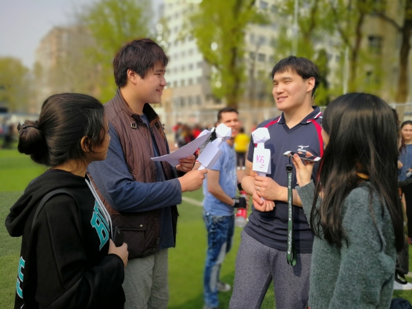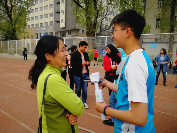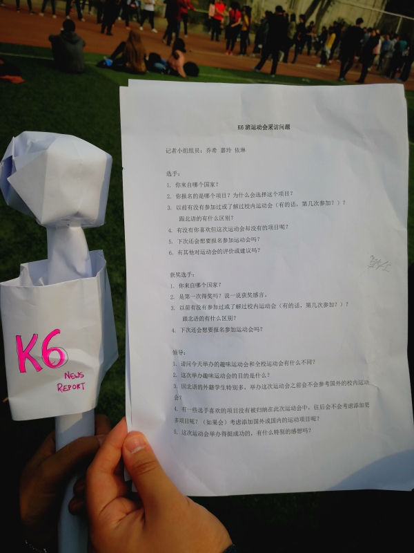 另外,就在学院几百名学生都沉浸于运动会所带来的欢乐时,有那么一批学生却在享受运动会的同时,努力的把这一切通过采访、拍照的形式记录下来,并写成新闻把其分享出去。他们便是预科学院汉语高级班的K6班的学生。而安排学生们进行采访的,则是他们的班主任张一萍老师。张老师在采访中表示,这是一次真实的任务,通过分组分工、设计问题、面对面采访不同的学生和老师,能够很好的锻炼学生的综合能力。