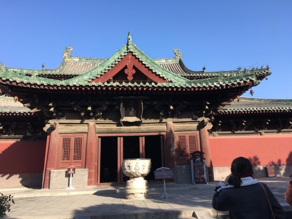 活络筋骨之后,同学们精神抖擞地出发去参观坐落于河北正定古城的隆兴寺。隆兴寺始建于隋朝,是中国十大名寺之一。其中最为著名的是被中国古建专家梁思成誉为世界古建筑孤例的宋代建筑摩尼殿、被鲁迅赞为“东方美神”的“倒座观音”以及中国最高的铜铸大佛“千手观音”。隆兴寺作为河朔名寺,历经千年,见证了唐宋至民国时期中国北方佛教文化的发展变化。
