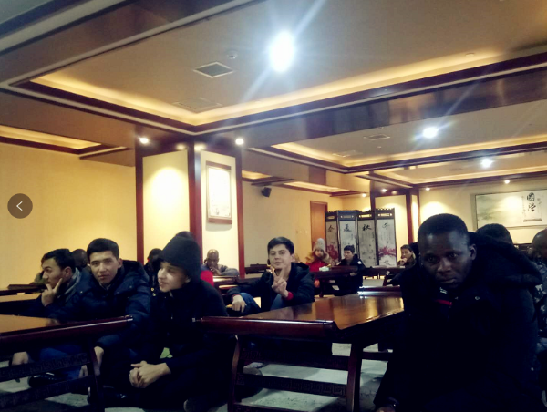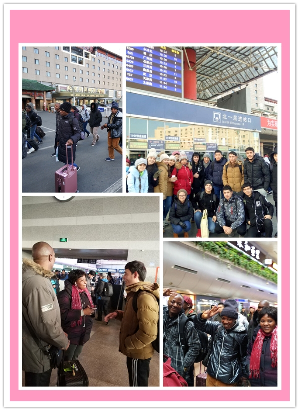 候车室里学生们用仅有的汉语词汇彼此交流着、笑声不断......